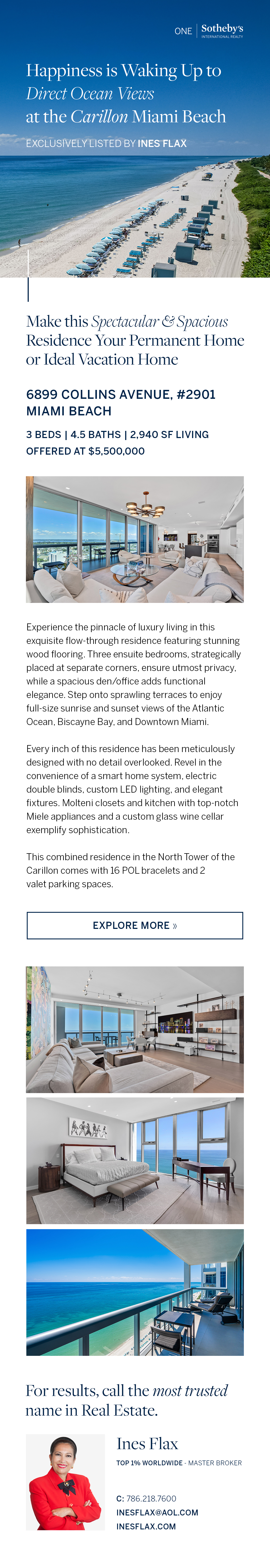 Carillon Beach is a one-of-a-kind health-oriented community on the ocean and one of the most vibrant cities on earth, Miami Beach. Residents enjoy access to 4 pools + 3 restaurants, a 70,000-sf award-winning spa & fitness center with over 200+ fitness classes per week, a full-service beach club to relax, 24/7 valet and security and a Michelin star restaurant "The Tambourine Room by Tristan Brandt" on site.
